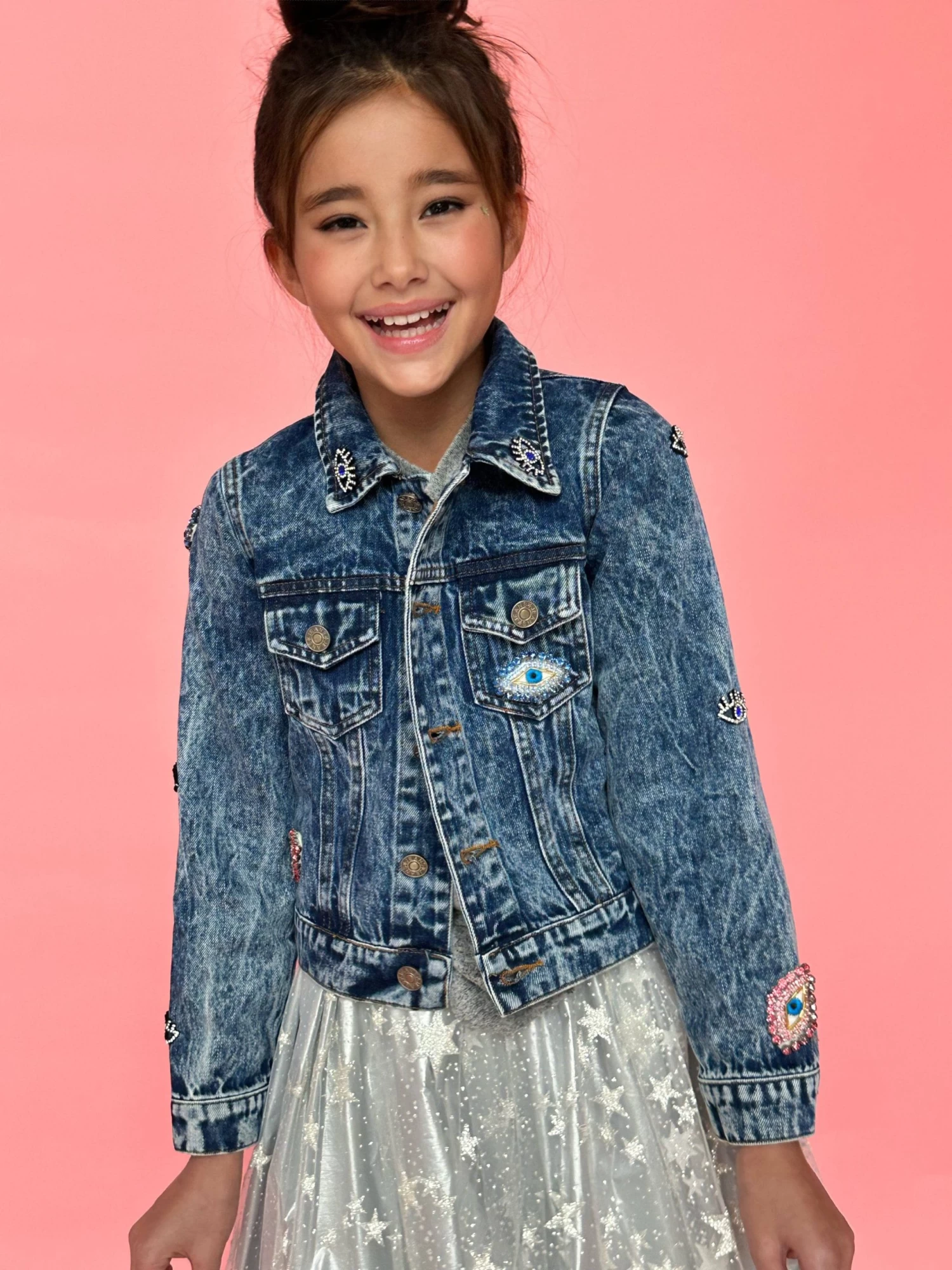 - Cropped Denim jacket adorned with crystal evil eyes all overÂ