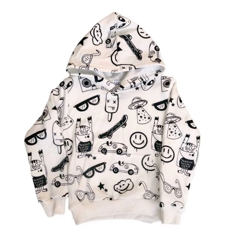 - Covered in various graffiti symbols, cars, skateboards, aliens, and ice cream