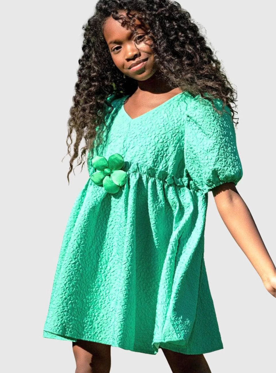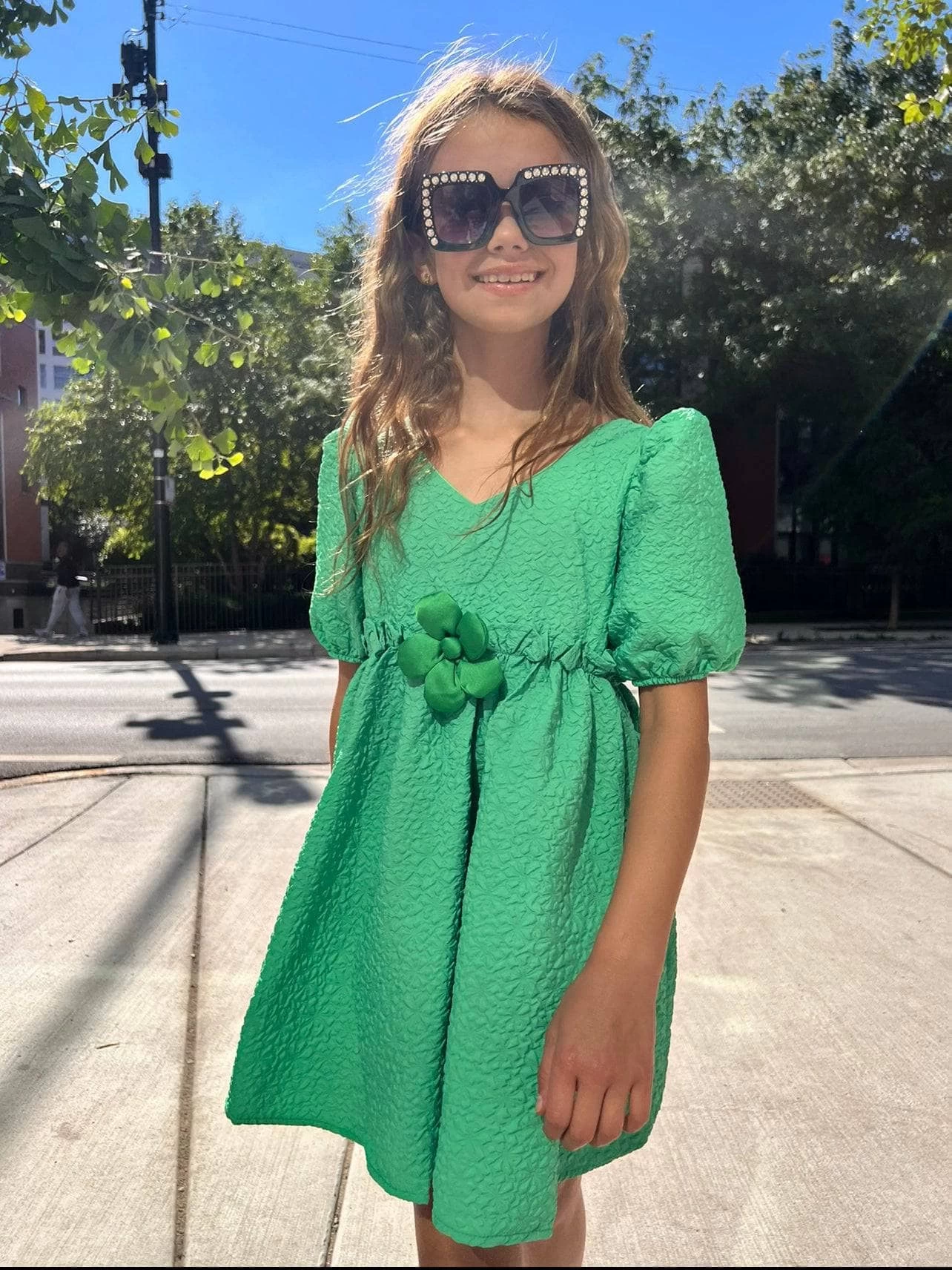 - Poof shoulder sleeves, with a cute flower pin