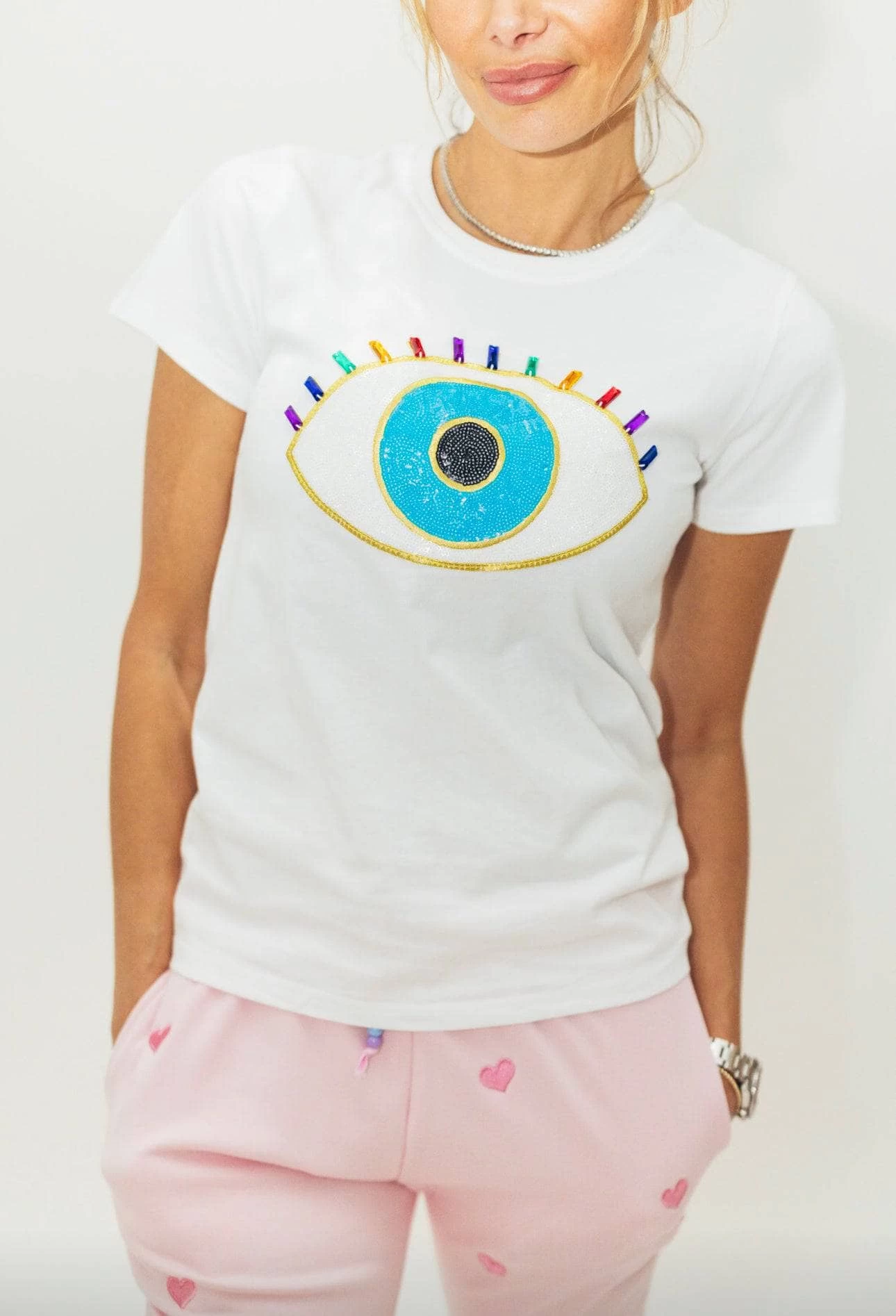- Embellished with a heavily beaded rainbow evil eye patch on the front
